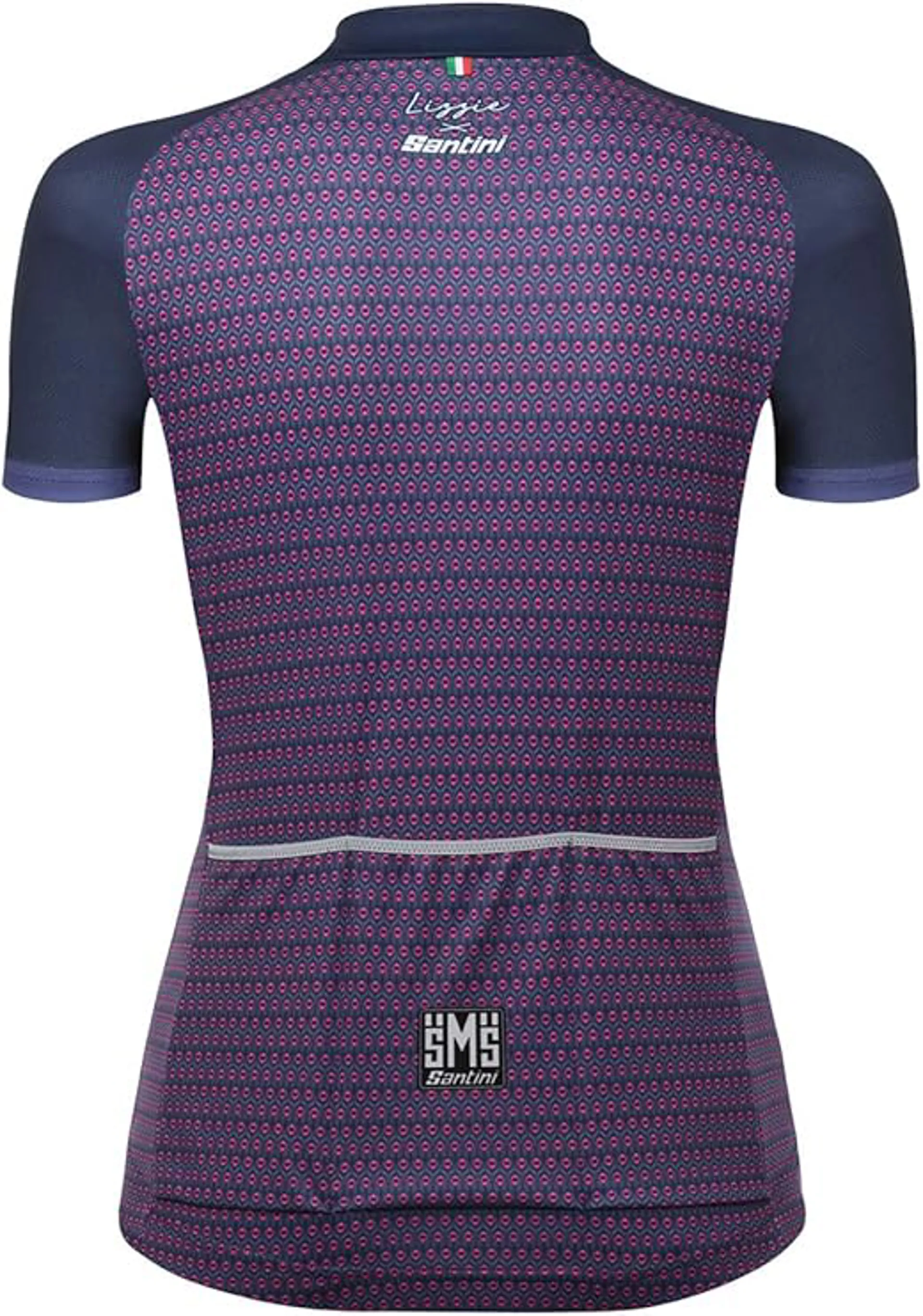 Giada is a great summer jersey with a classic cut that fits all women. Suitable for hot summer days, it is made of Energy Microsense fabric, lightweight and breathable. Elastic with inner silicone at the waist to keep the jersey in position while pedaling. Featuring reflective piping over the triple back pocket for maximum safety while riding in the dark. Finished with a stylish reverse coil full length zipper. Eye-catching design with a peacock eye pattern, theme of the Lizzie x Santini collection, on front and back.