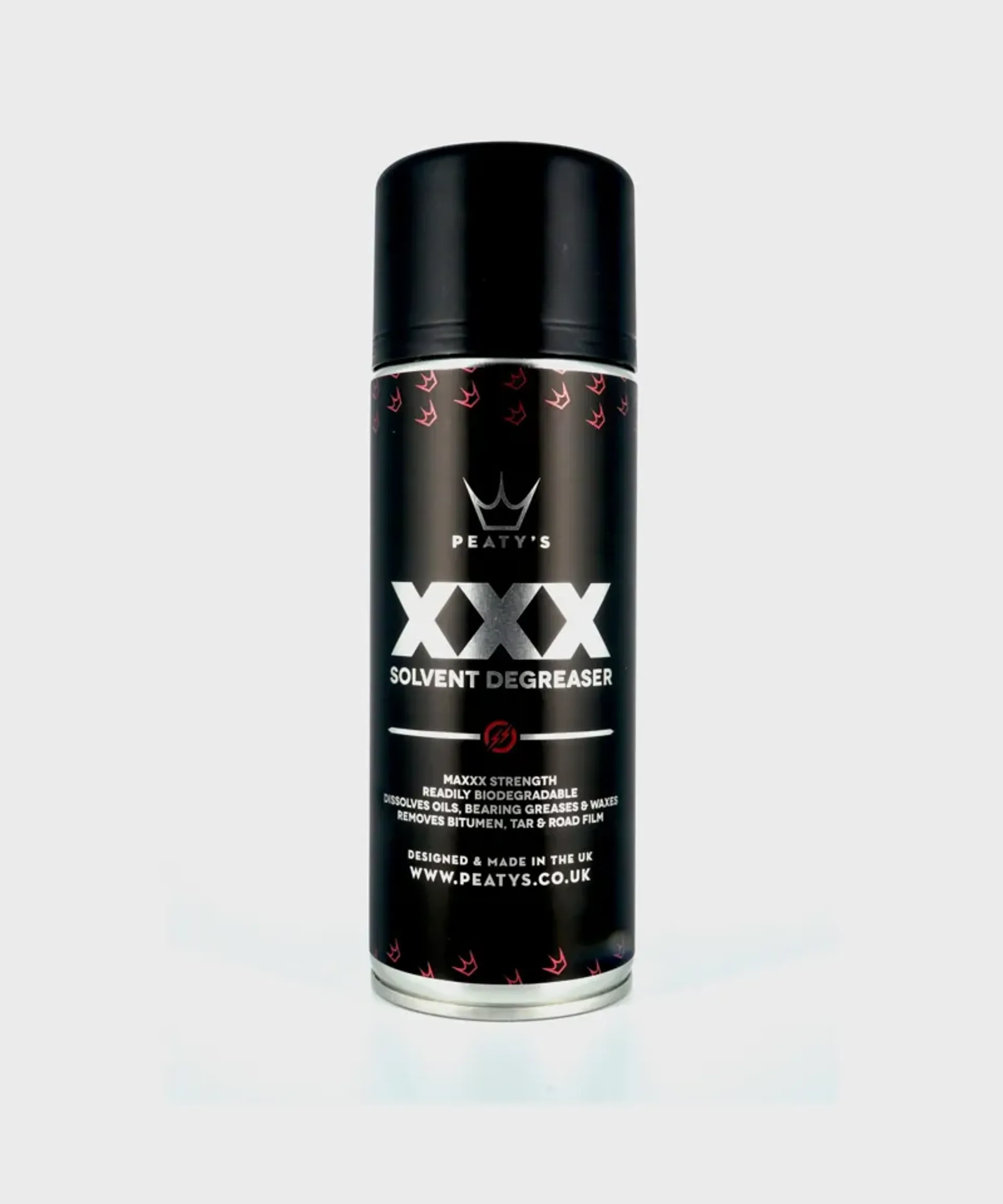 Peaty's XXX Solvent Degreaser is a powerful maxxx strength water-soluble and readily biodegradable solvent degreaser and de-waxer designed for complete removal of bearing greases waxes oils and bitumen & tar stains. For use on metallic surfaces but also safe for use on carbon fibre and many other plastics and painted surfaces.